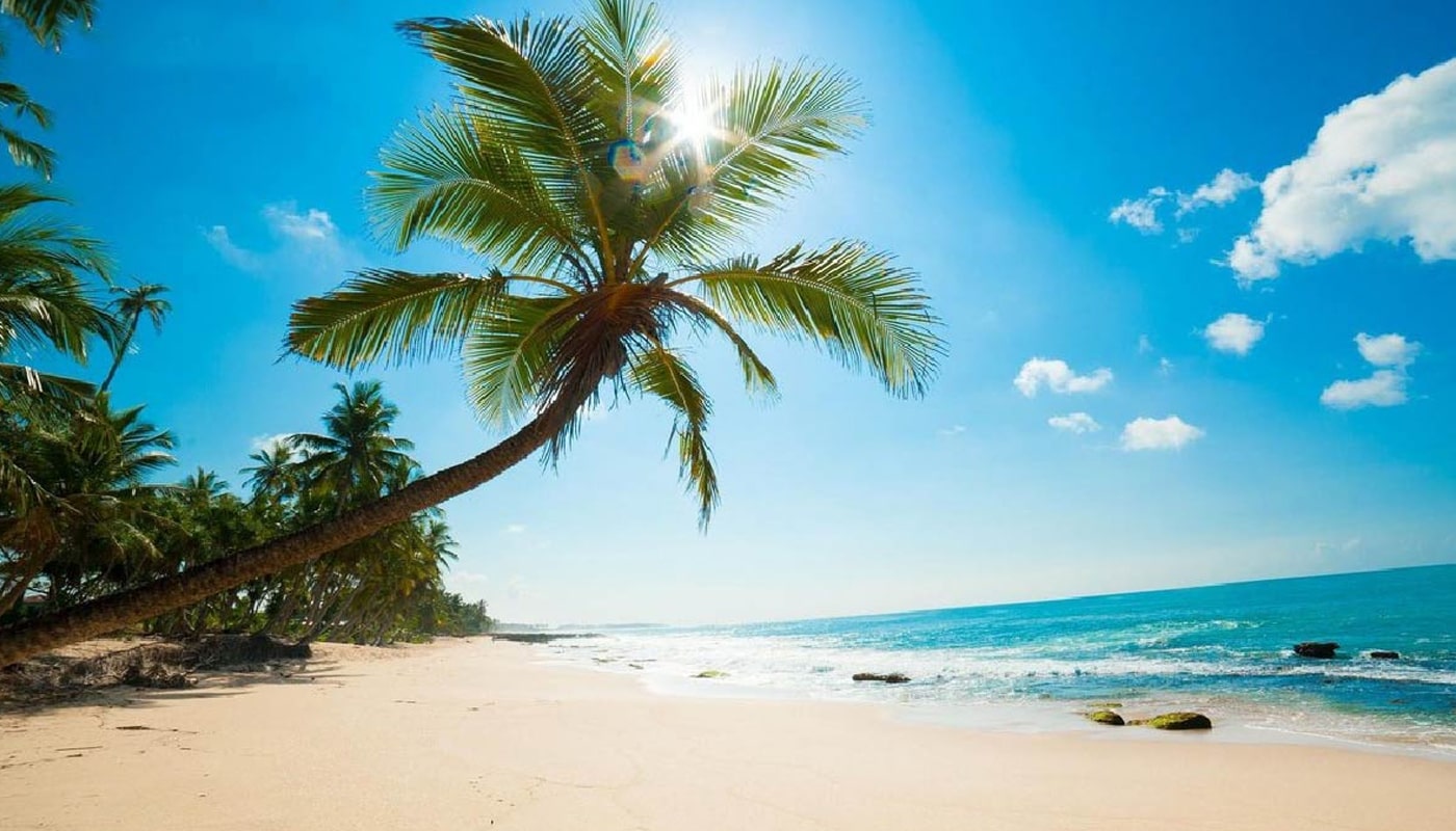 یک ساحل زیبا با درختان نارگیل که منظرهای خاص و دلنشین ایجاد کرده است.